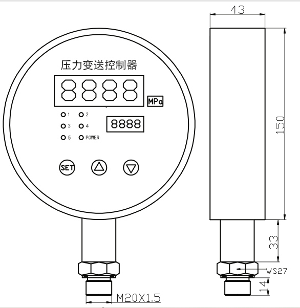 The PYK150 intelligent pressure controller is an intelligent digital pressure measurement and control product that integrates pressure measurement, display, output, and five-way control. Stainless steel joint, diffused Silicon pressure core body, whole digital circuit board, display intuitive, simple operation, safe and reliable, switch point set on site. Widely used in hydropower, tap water, petroleum, chemical, mechanical, hydraulic and other industries, the pressure of the fluid medium is measured and controlled, and the output(4-20mA) and RS485 network can be transmitted.