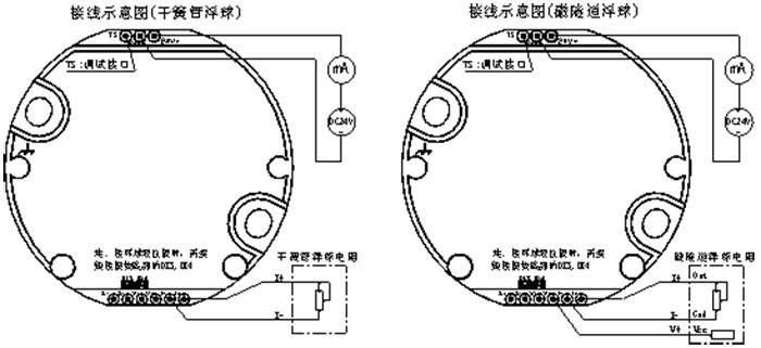 4.4菜單說(shuō)明 本儀表菜單分為“生產(chǎn)調(diào)試菜單”;“普通用戶菜單”兩級(jí),由各級(jí)菜單的進(jìn)入密碼做為區(qū)分。 ?“生產(chǎn)調(diào)試菜單” 進(jìn)入密碼為“0066”,由變送器生產(chǎn)廠家使用,對(duì)變送器的基本參數(shù)進(jìn)行設(shè)置,決定了變送器的精度,標(biāo)定值等參數(shù),因此生產(chǎn)調(diào)試菜單不能對(duì)一般用戶開(kāi)放,以免標(biāo)定數(shù)據(jù)被破壞。 ?“用戶菜單” 進(jìn)入密碼為“00016”,是針對(duì)變送器現(xiàn)場(chǎng)使用要求進(jìn)行一些特殊設(shè)置時(shí)使用。 注:在用戶菜單設(shè)定時(shí),若30秒內(nèi)無(wú)任何按鍵操作,將自動(dòng)退出設(shè)定并返回到測(cè)量模式。 4.4.1密碼設(shè)定菜單 Lock: 密碼輸入菜單,可設(shè)范圍(-1999~9999) 4.4.2工廠調(diào)試菜單 -Sn-:輸入信號(hào)放大倍數(shù)設(shè)定,可設(shè)范圍(1,2,4,8,16,32,64,128,256) 由于市場(chǎng)上的傳感器類型較多,其靈敏度不一致。可以通過(guò)面板按鍵調(diào)整放大倍數(shù),具體參考標(biāo)準(zhǔn)為傳感器在滿度狀態(tài)下查看Ad-H菜單的值,此值的絕對(duì)值一般在10000~30000之間是合理的。超出此范圍需要調(diào)整放大倍數(shù)。一般擴(kuò)散硅設(shè)置為16,陶瓷設(shè)置為128即可。 Ad-L: 零位采集 設(shè)定此菜單時(shí)需要給變送器施加“dP-L”菜單設(shè)定的壓力,按下“SET”鍵時(shí)顯示表頭內(nèi)部保存的采集值,此時(shí)按下“?”或“▲”時(shí)開(kāi)始采集本次采集,待數(shù)據(jù)穩(wěn)定后再次按下“SET”鍵確認(rèn)本次采集。 注意:如果采集值大于0x7000時(shí),需要在“-Sn-”菜單中減小放大倍數(shù), 給用戶使用時(shí)留出一定的上限余量避免溢出。 Ad-H: 滿位校正點(diǎn) 設(shè)定此菜單時(shí)需要給變送器施加“dP-H”菜單設(shè)定的壓力,按下“SET”鍵時(shí)顯示表頭內(nèi)部保存的采集值,此時(shí)按下“?” 或“▲”時(shí)開(kāi)始采集本次采集,待數(shù)據(jù)穩(wěn)定后再次按下“SET”鍵確認(rèn)本次采集。 注意:如果采集值大于0x7000時(shí),需要在“-Sn-”菜單中減小放大倍數(shù), 給用戶使用時(shí)留出一定的上限余量避免溢出。 So-L: 零點(diǎn)電流設(shè)定 此菜單為變送器量程零位時(shí)的電流輸出值,需要在變送器供電回路中串接高精度電流表,按壓“?”或“▲”鍵修改設(shè)置,將電流調(diào)至標(biāo)準(zhǔn)4mA或用戶要求的電流值,按壓“SET” 鍵確認(rèn)。 So-H:滿點(diǎn)電流設(shè)定,可設(shè)范圍(3.900mA~21.000mA) 此菜單為變送器量程零位時(shí)的電流輸出值,需要在變送器供電回路中串接高精度電流表,按壓“?”或“▲”鍵修改設(shè)置,將電流調(diào)至標(biāo)準(zhǔn)20mA或用戶要求的電流值,按壓“SET” 鍵確認(rèn)。 -dP-: 顯示精度設(shè)置,可設(shè)范圍(0~3) 顯示分辨率即測(cè)量模式時(shí)顯示的小數(shù)位數(shù),用戶可根據(jù)現(xiàn)場(chǎng)使用要求對(duì)其設(shè)定,顯示小數(shù)位數(shù)并非越多越好,應(yīng)優(yōu)先保證顯示值的穩(wěn)定。 dP-L:標(biāo)定量程下限設(shè)定,可設(shè)范圍(-1999~9999) 此設(shè)定值對(duì)應(yīng)生產(chǎn)時(shí)所加的零位壓力值。 dP-H: 標(biāo)定量程上限設(shè)定,可設(shè)范圍(-1999~9999) 此設(shè)定值對(duì)應(yīng)生產(chǎn)時(shí)所加的滿點(diǎn)壓力值。 LInE:中點(diǎn)線性修正設(shè)定 給變送器施加量程中點(diǎn)壓力,查看變送器實(shí)際電流輸出,變送器中點(diǎn)理論電流值減去實(shí)測(cè)電流值的差值即為線性修正值,注意有正負(fù)的區(qū)分。 注意:為了保證變送器中點(diǎn)電流輸出的準(zhǔn)確性,本款表頭中點(diǎn)修正時(shí)以電流值為參考計(jì)算線性修正值,而不是以顯示來(lái)計(jì)算。 ZErO: 零滿屏蔽系數(shù),可設(shè)范圍(0.00~1.00) 此菜單設(shè)定值表示零滿屏蔽范圍,設(shè)定值為“0.0”時(shí)為關(guān)閉零滿屏蔽功能。舉例:設(shè)定為0.10時(shí)表示當(dāng)變送器輸出接近零點(diǎn)或滿點(diǎn)加減變送量程的0.10%時(shí),變送器輸出會(huì)自動(dòng)穩(wěn)定在零點(diǎn)或滿點(diǎn)上,不會(huì)出現(xiàn)因干擾而輸出跳動(dòng)現(xiàn)象。 bS-L: 變送量程下限設(shè)定,可設(shè)范圍(-1999~9999) 此功能可實(shí)現(xiàn)變送輸出的零點(diǎn)無(wú)源遷移,其設(shè)定的壓力值將對(duì)應(yīng)到“So-L”零點(diǎn)電流菜單設(shè)定電流值,為了方便用戶設(shè)定,變送器的變送最小量程可按傳感器量程的3:1進(jìn)行壓縮,最大量程可按傳感器量程的1:1進(jìn)行設(shè)置,超出此范圍將影響變送輸出精度。 bS-H: 變送量程上限設(shè)定,可設(shè)范圍(-1999~9999) 此功能可實(shí)現(xiàn)變送輸出的滿點(diǎn)無(wú)源遷移,其設(shè)定的壓力值將對(duì)應(yīng)到“So-H”滿點(diǎn)電流菜單設(shè)定電流值,變送器的變送最小量程可按傳感器量程的3:1進(jìn)行壓縮,最大量程可按傳感器量程的1:1進(jìn)行設(shè)置。超出此范圍將影響變送輸出精度。 End: 退出設(shè)定菜單 在此菜單下按“SET”鍵,退出設(shè)置模式,并保存設(shè)置數(shù)據(jù)。 4.4.3普通用戶菜單 bS-L: 變送量程下限設(shè)定,可設(shè)范圍(-1999~9999) 此功能可實(shí)現(xiàn)變送輸出的零點(diǎn)無(wú)源遷移,其設(shè)