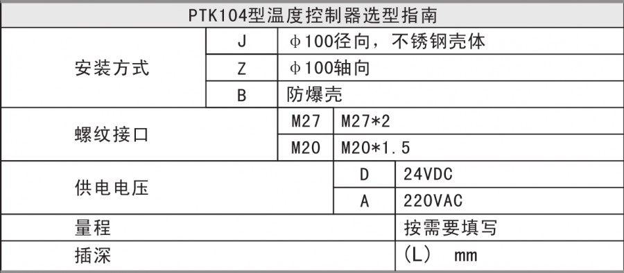 PTK104智能數(shù)字溫度控制器是集溫度測(cè)量、顯示、輸出、控制于一體的智能數(shù)字溫度測(cè)控產(chǎn)品。不銹鋼接頭、高精度PT100、全數(shù)字電路板組成,顯示直觀,操作簡(jiǎn)單,安全可靠,開關(guān)點(diǎn)現(xiàn)場(chǎng)設(shè)置。廣泛應(yīng)用于水電、自來(lái)水,石油、化工、機(jī)械、液壓等行業(yè),對(duì)流體介質(zhì)的溫度進(jìn)行測(cè)量和控制。